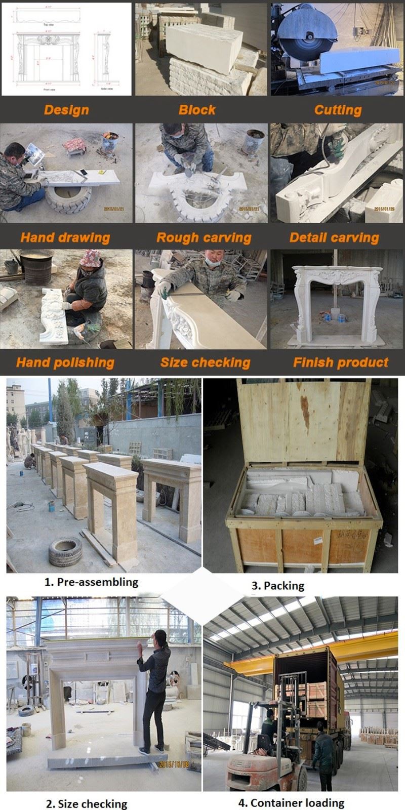 This fireplace mantel is made of Nero Marquina Marble, which having black tons with white veins. Irregular lines on the surface highlight flexibility and nature. With carved flowers and leaves on the upper plate, other fluency lines and smooth corner angels show a simple and contemporary design style. This marble mantel is very matched for simple home fittings and the modern decoration style.