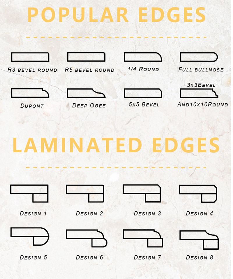 Full Bullnose, Half Bullnose, Flat Eased(eased edge), Bevel Top, Radius Tops, Laminated, Ogee Edge, Beveled Processed, etc. |