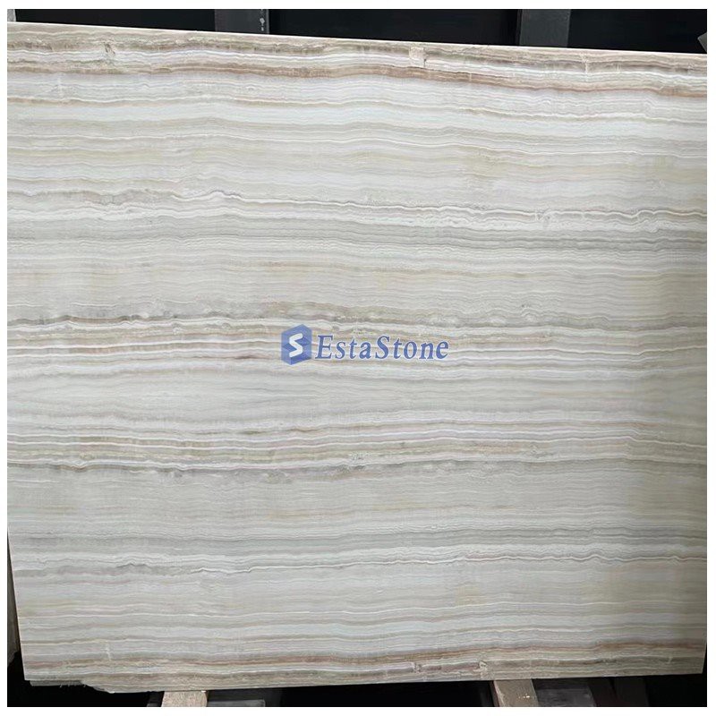 Ivory White Onyx Slab is a semi-precious stone with quite roasted veins in a pale cream tint. Onyx is an agate in the chalcedony family, and the stratification drawings have an important creative function. Ivory Onyx Marble Slab is perfect for large format backlit coverings and as a lighting element in high-quality furniture.