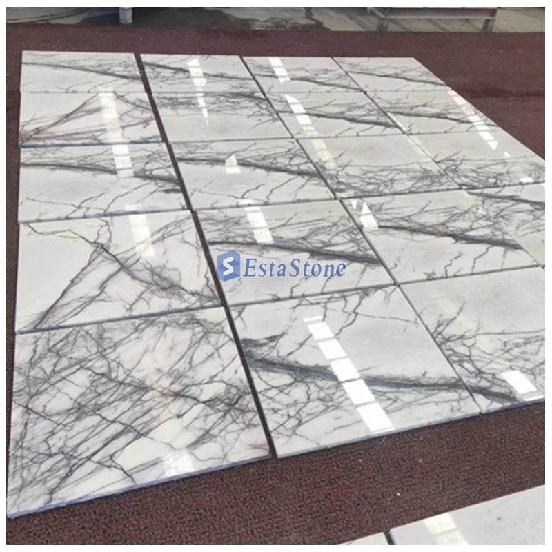 Este é um pedra natural poética do ladrilho de mármore Lilás Milas; a superfície geral da laje assemelha-se a uma pintura chinesa feita com tinta sobre ônix branco. O fundo branco leitoso e luminoso parece uma montanha após uma forte nevasca, enquanto as linhas pretas e cinzentas lembram árvores e flores na montanha.